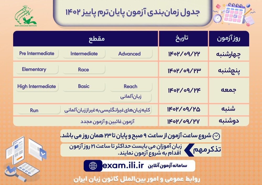 به گزارش روابط عمومی و امور بینالملل کانون زبان ایران، آزمون پایانترم پاییز ۱۴۰۲ این مجموعۀ آموزشی در روزهای ۲۲، ۲۳، ۲۴ و ۲۵ آذرماه طبق جدول زمانبندی که در ادامه آمده است برگزار خواهد شد.
