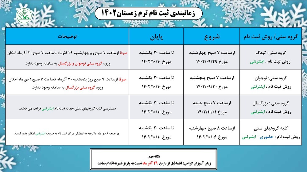 برای گروه سنی نوجوانان از ساعت ۷ صبح پنجشنبه ۳۰ آذرماه و