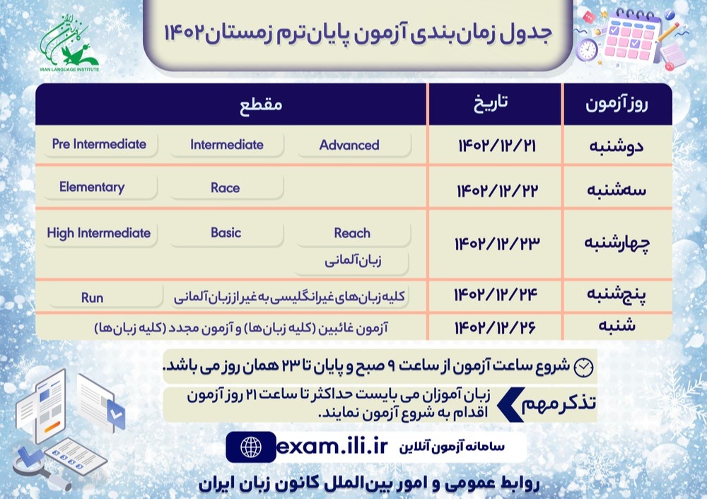 به گزارش روابط عمومی و امور بین‌الملل کانون زبان ایران، آزمون پایان‌ترم زمستان ۱۴۰۲ این مجموعۀ آموزشی در روزهای ۲۱، ۲۲، ۲۳، ۲۴ و ۲۶ اسفندماه طبق جدول زمان‌بندی که در ادامه آمده است برگزار خواهد شد.