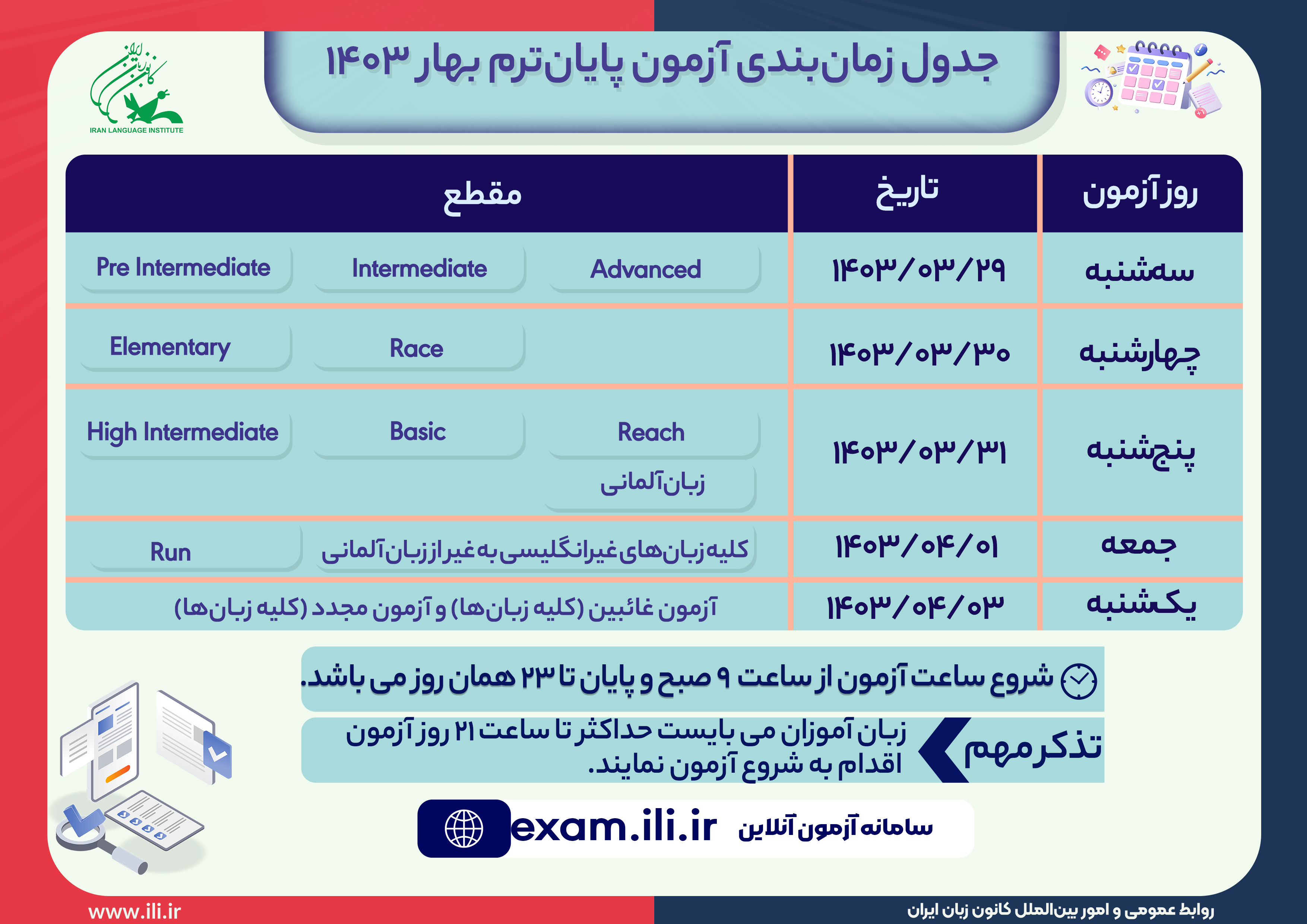 آزمون غایبین و آزمون مجدد در روز ۳ تیرماه از ساعت ۹:۰۰ صبح تا ۲۳:۰۰ همان روز برگزار میشود، از زبانآموزانی که در روز آزمون غایبین شرکت مینمایند