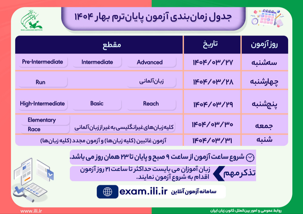 به گزارش روابط عمومی و امور بینالملل کانون زبان ایران، آزمون پایانترم بهار ۱۴۰۴ این مجموعۀ آموزشی از روز سهشنبه ۲۷ خردادماه تا شنبه ۳۱ خردادماه طبق جدول زمانبندی که در ادامه آمده است برگزار خواهد شد.