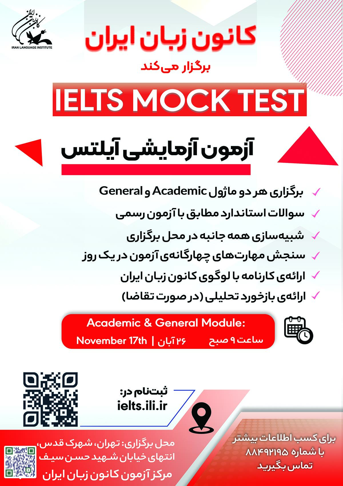 آزمون آزمایشی آیلتس (IELTS) در دو بخش تحصیلی(Academic) و عمومی (General) در تاریخ 26 آبان ماه برگزار خواهد شد.
